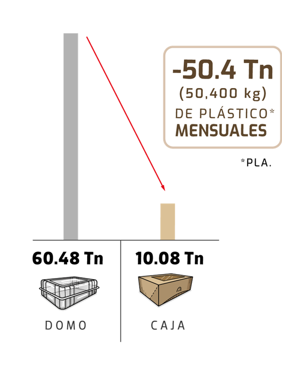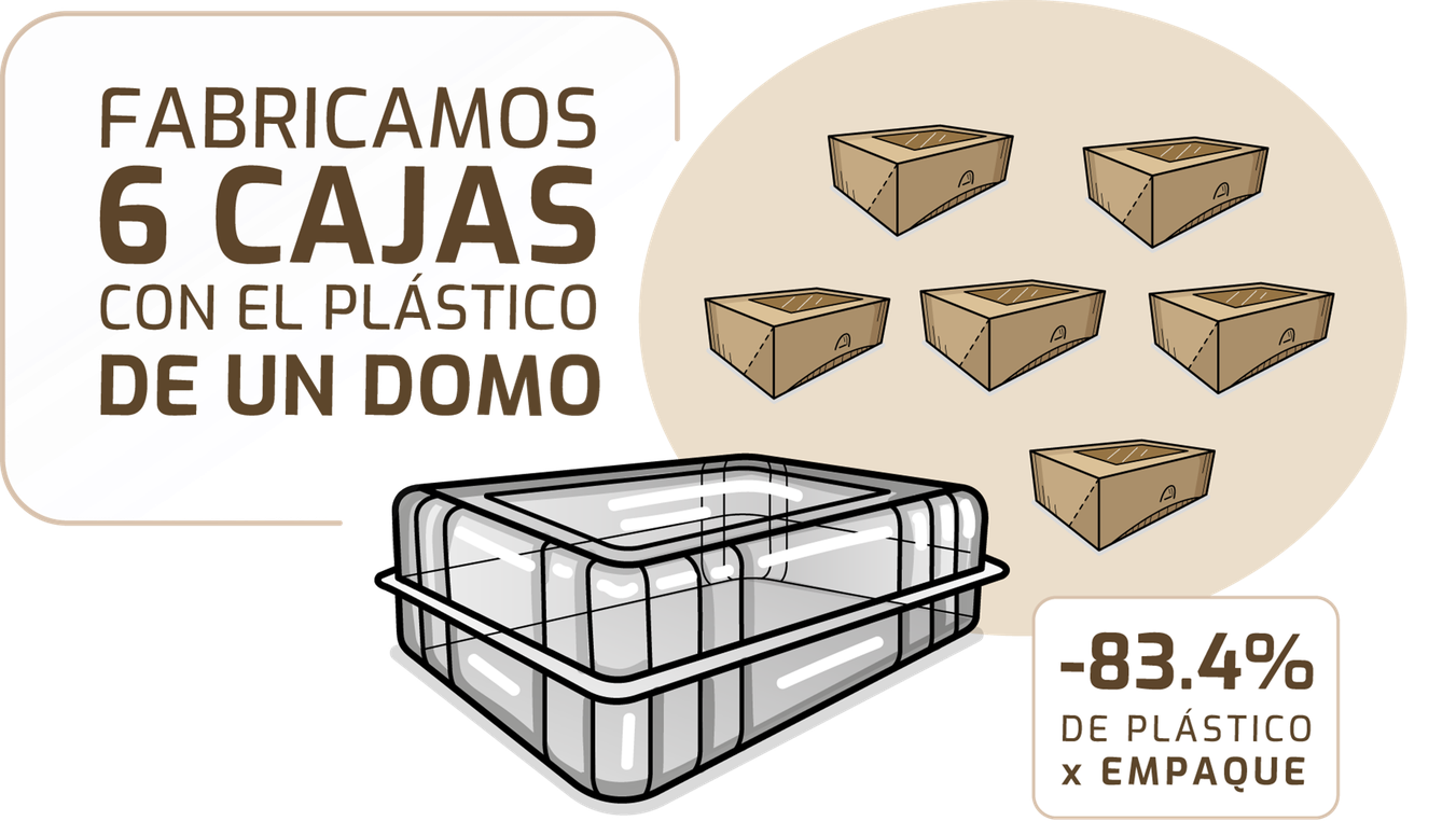 Desde Compospack, el reto no fue solo cambiar de material, sino repensar el sistema completo del empaque. A través de un proceso de investigación, análisis de uso y ecodiseño, se evaluó el desempeño del domo plástico y su impacto en volumen de material, frecuencia de consumo y generación de residuos. El resultado fue un rediseño estructural que permitió optimizar el uso del plástico, logrando que la materia prima necesaria para un solo domo se transformara en seis cajas de cartón funcionales, sin comprometer protección, visibilidad ni experiencia del producto.